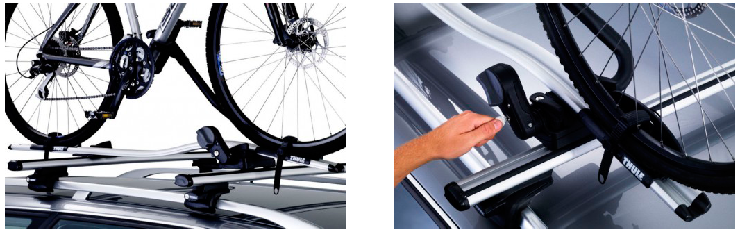 При снятии переднего колеса заднее ставится стандартно. Спереди устанавливается рейка для закрепления велосипеда. Такие приспособления необходимы в количестве двух-трех штук, ведь на поперечинах можно установить несколько одинаковых велосипедов. Таким образом, они не будут помехой и ухудшать аэродинамику.