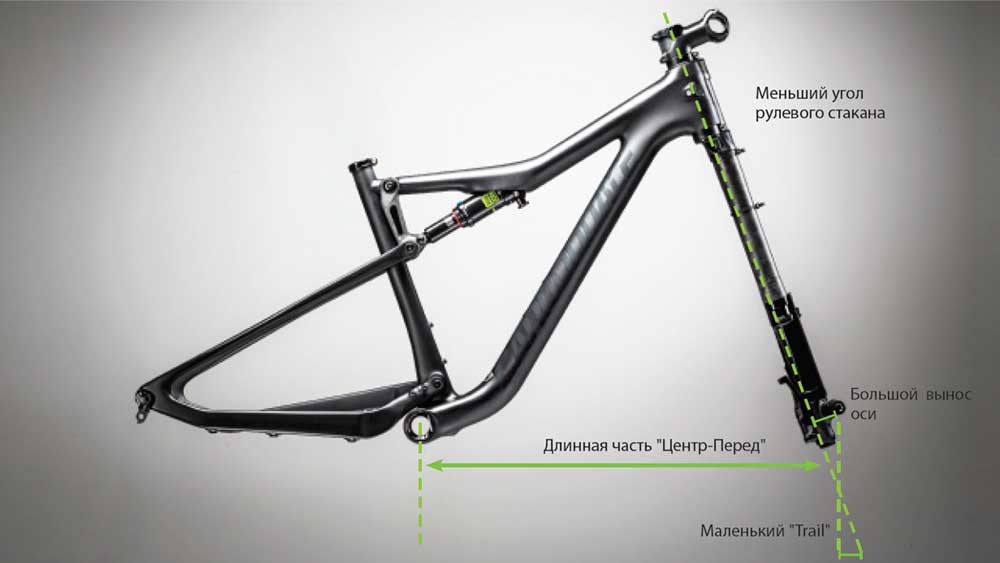 OutFront — уменьшенный угол рулевого стакана совместно с большим выносом (offset) оси (rake) повышают стабильность при управлении и делают велосипед проворнее.ПОЧЕМУ ЭТО ВАЖНО: