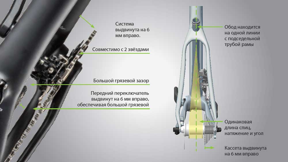 Запатентованная система благодаря которой Cannondale сдвинули систему во внешнюю сторону на 6 мм, и получили ультра-короткие перья и жёсткое заднее колесо, без каких-либо компромиссов.ПОЧЕМУ ЭТО ВАЖНО: