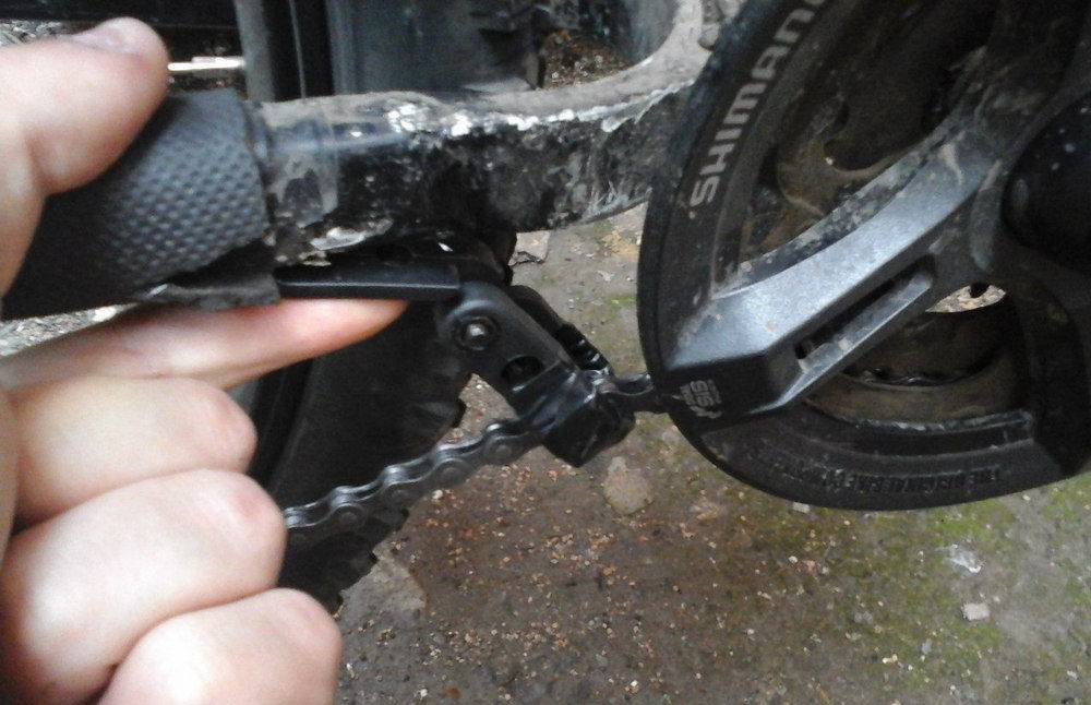 Оптимальное положение роликов натяжителя – параллельно задней системе звезд, то есть цепь ходит по нему прямо и без перекосов. В противном случае погнут держатель системы переключения. Для его выравнивания нужно схватить и потянуть все устройство (переключатель), а не только натяжитель.