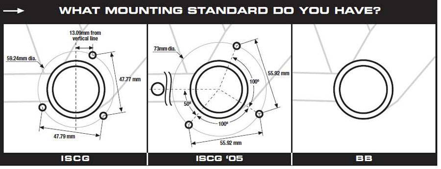 - ISCG (International Standard Chain Guide) – крепление на раму болтами в трёх точках, расположенных по окружности. Диаметр окружности — 59,24 мм, расстояние между точками крепления — 47,77 мм;