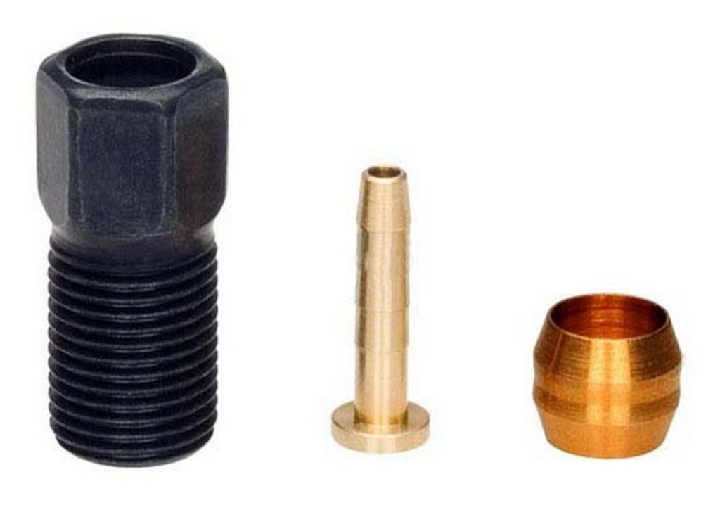 После того, как выполнено подрезание, следует установить компрессионный фитинг или оливку, вначале надев гайку, а затем, зажим. Перед выполнением работы, обязательно читают инструкцию от производителя, прилагаемую к дисковым тормозам, т.к. одни зажимы могут быть направленными, другие – с фаской.