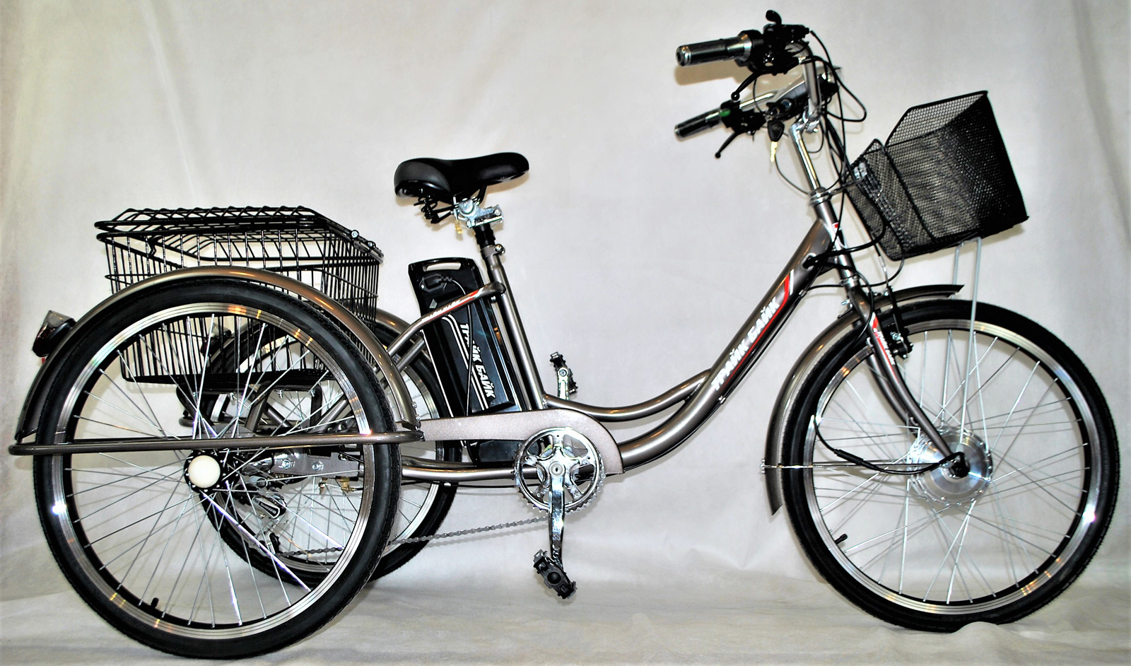 Велосипед, который имеет распространенность среди пользователей. Рама трицикла изготовлена из стали, ввиду чего сможет выдерживать значительные нагрузки. Задняя ее часть с корзинкой может выдержать до 50 кг груза. Колеса сделаны на основе двойных ободов с прочными спицами из стали. Это делает велогибрид уникальным для использования за чертой города, где необходимо время от времени осуществлять перевозки нетяжелых грузов.