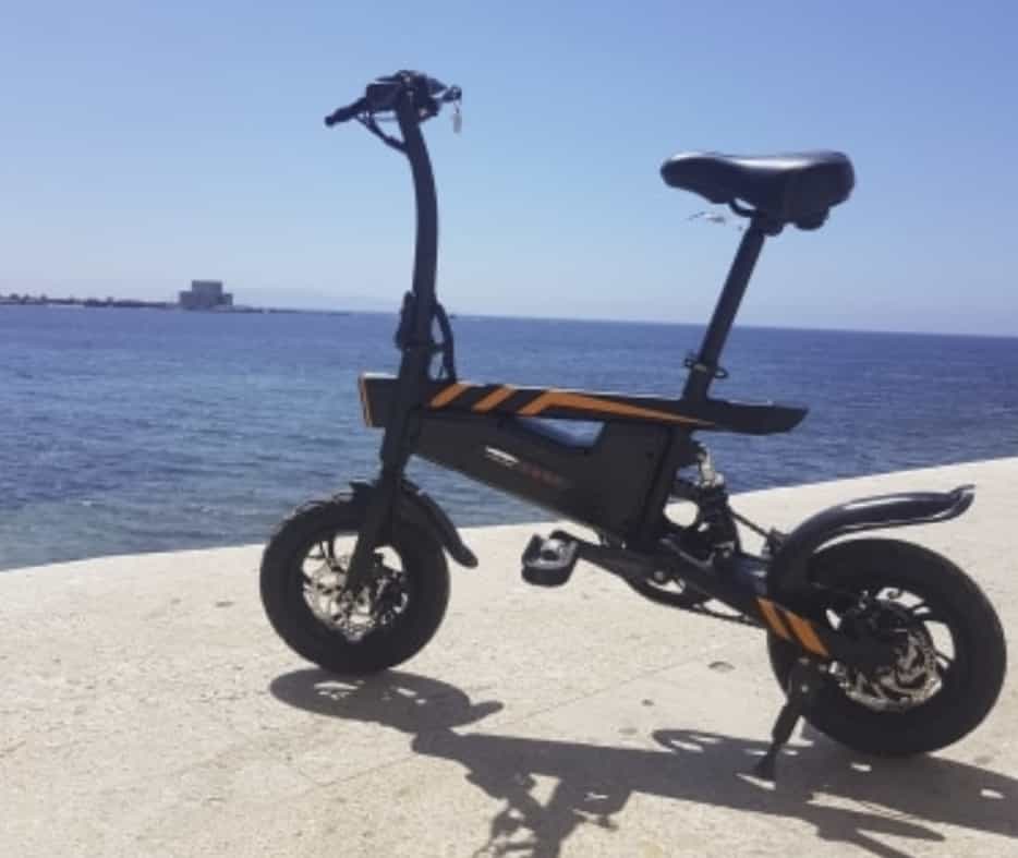 Данный электробайк предназначен для легких поездок по городу если ваш вес не превышает 100 кг. Такова максимальная нагрузка, которую выдерживает данный байк. Его рама изготовлена из алюминиевого сплава. Жилка жесткая, амортизация отсутствует. Так что, поездки по ухабистой природной местности не самое подходящее решение. Тормоза дисковые механические. Всего шесть скоростей, за регулировку которых отвечает задний переключатель Shimano. Оснащен двигателем с мощностью 250 Вт, емкость аккумулятора 10 А·ч. Всего на зарядку уходит 6 часов. Руль и педали складываются.