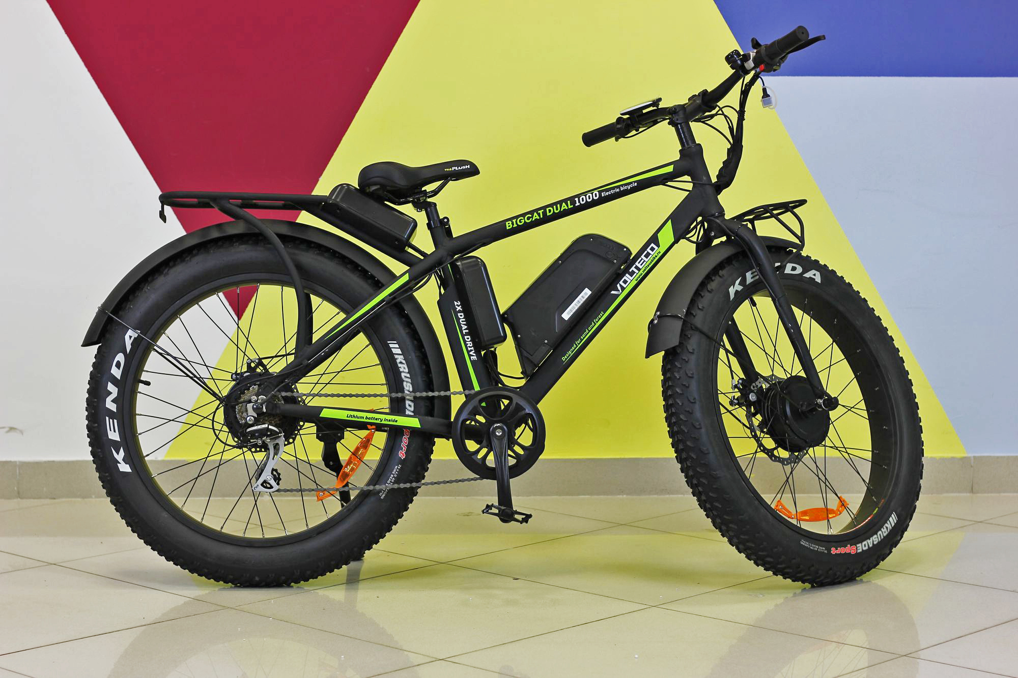 - Volteco Bigcat Dual 1000. Мощный, надежный велосипед с парой мотор-колес по 500 ВТ каждое. Подойдет для езды по бездорожью. Оснащен противоугонной системой, сканером отпечатков пальцев.