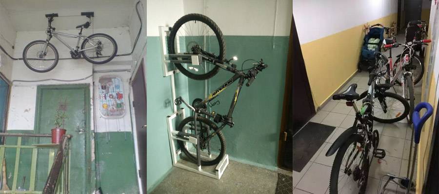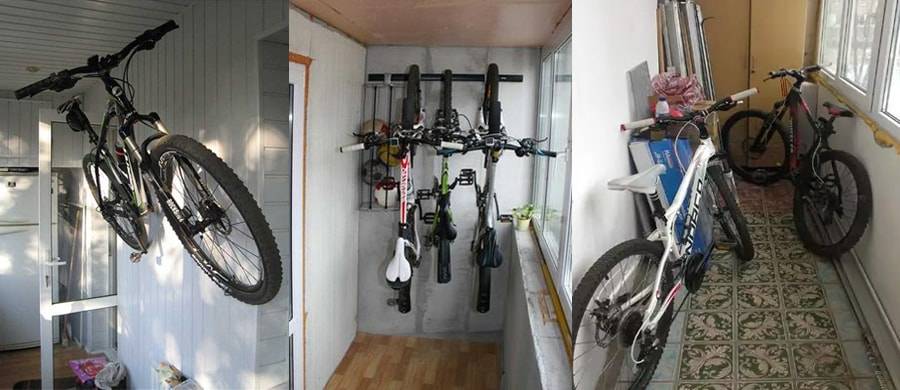 В квартире без балкона можно хранить велосипед в глубоком шкафу в прихожей или гардеробе. В шкафу велосипед подвешивается вертикально за колесо. На специальных стеллажах для хранения велосипедов — горизонтально.