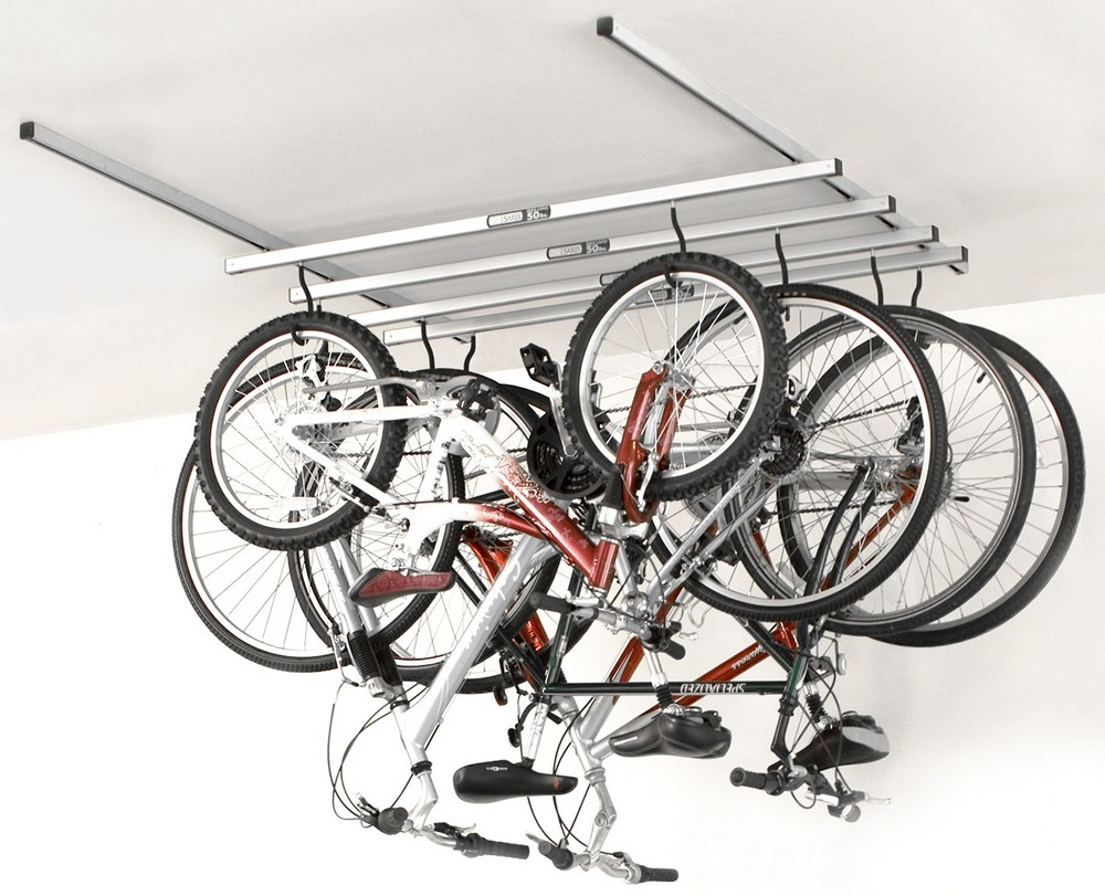 При этом места для установки блоков на потолке можно выбирать произвольно, исходя из условий хранения велотехники.