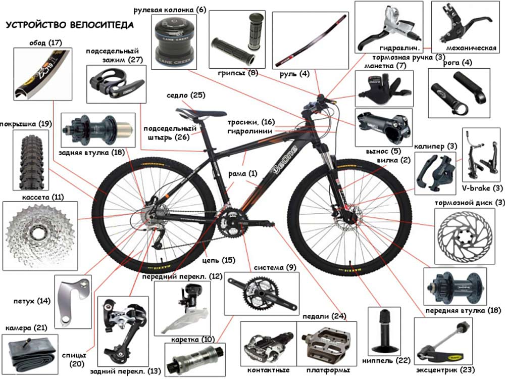 Для начала давайте разберёмся, какими деталями вообще располагает среднестатистический байк. Итак, современный велосипед состоит в общей сложности примерно из двенадцати деталей.