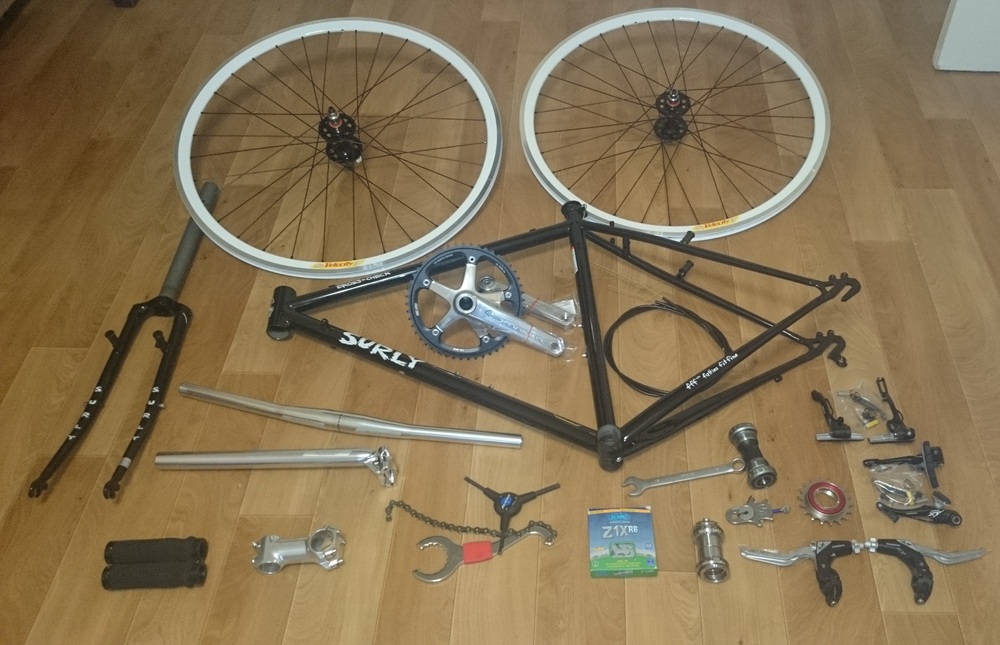 Итак, комплектующие закуплены и разложены по кучкам на полу. Осталось только пошагово собрать их воедино и, желательно, получить велосипед.