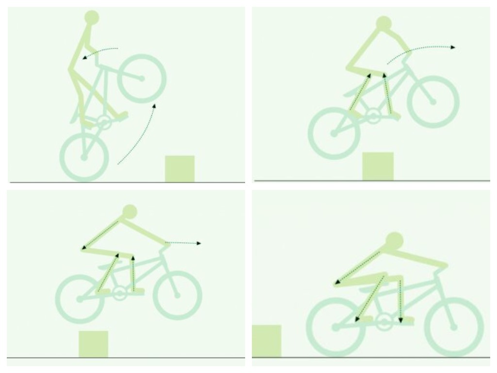 Если техника выполнения правильная, то приземлиться велосипед должен на заднее колесо. Положение велосипедиста после перескока: ноги согнуты, руки прямые (как бы еще подтягивают руль), тело откинуто назад, а значительная часть веса приходится на заднее колесо.