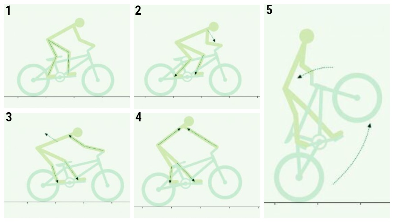 - Выпрямиться и перенести вес всего тела назад. Кроме туловища, необходимо с силой выпрямлять ноги и подтянуть руль на себя – так велосипед примет наклонное положение.