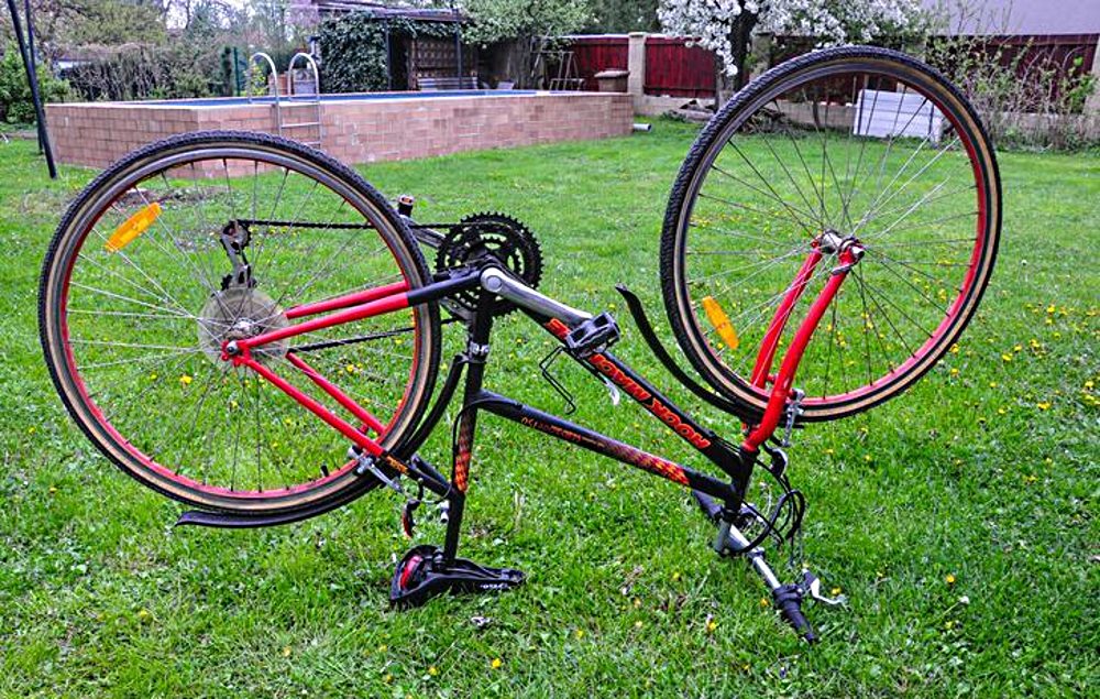 - Переворачиваем велосипед вверх колёсами, ставим его на руль и сиденье. Можно обойтись и без специальной стойки для ремонта велосипеда, главное, придать ему устойчивое положение.
