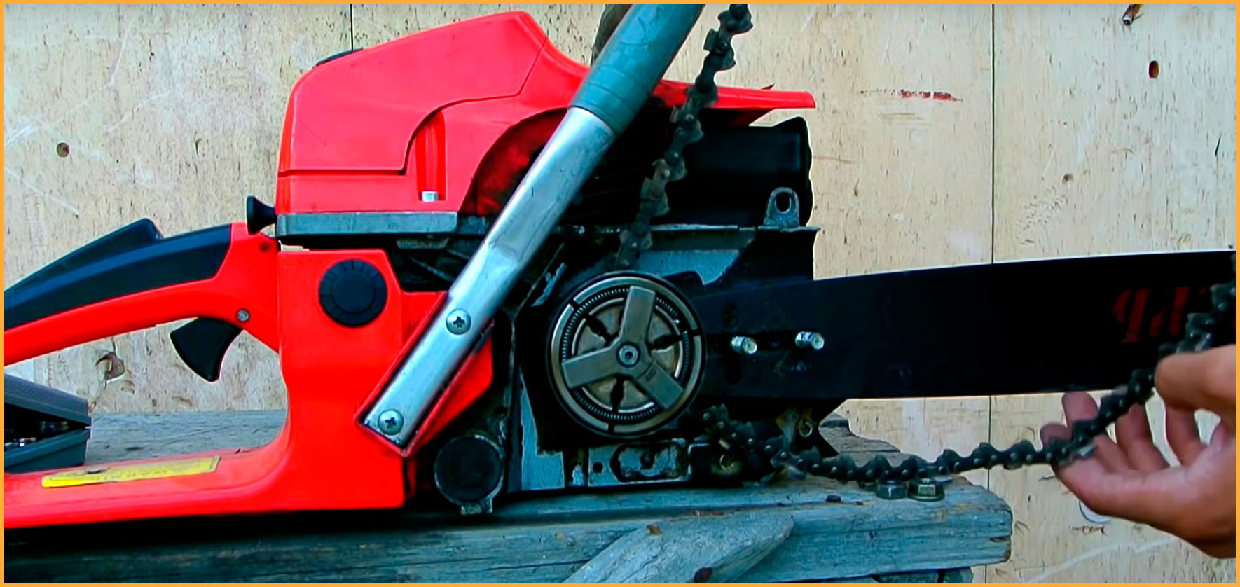 Начнем с установки двигателя от бензопилы. При этом можно избежать полной разборки конструкции, достаточно снять шину.
