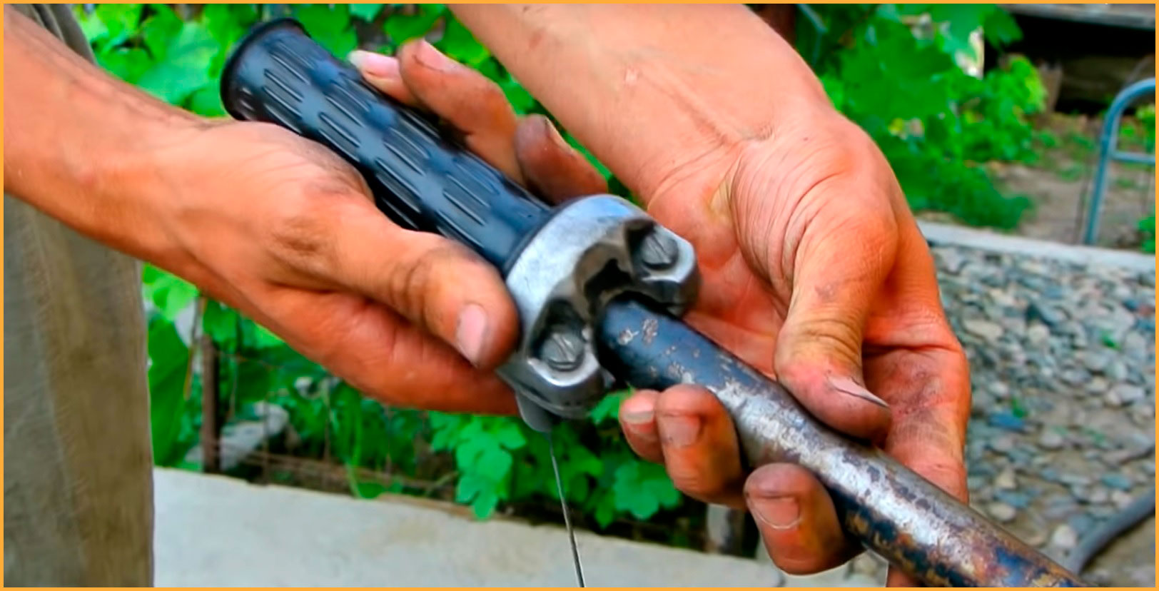6. Далее выводим органы управления на руль, для этого пропускаем трос от дроссельной заслонки бензопилы до руля. Придется заменить ручку поворотным аналогом от мотоцикла, а к ней уже прикрепить трос;