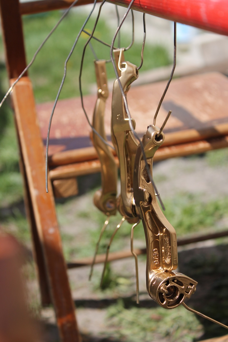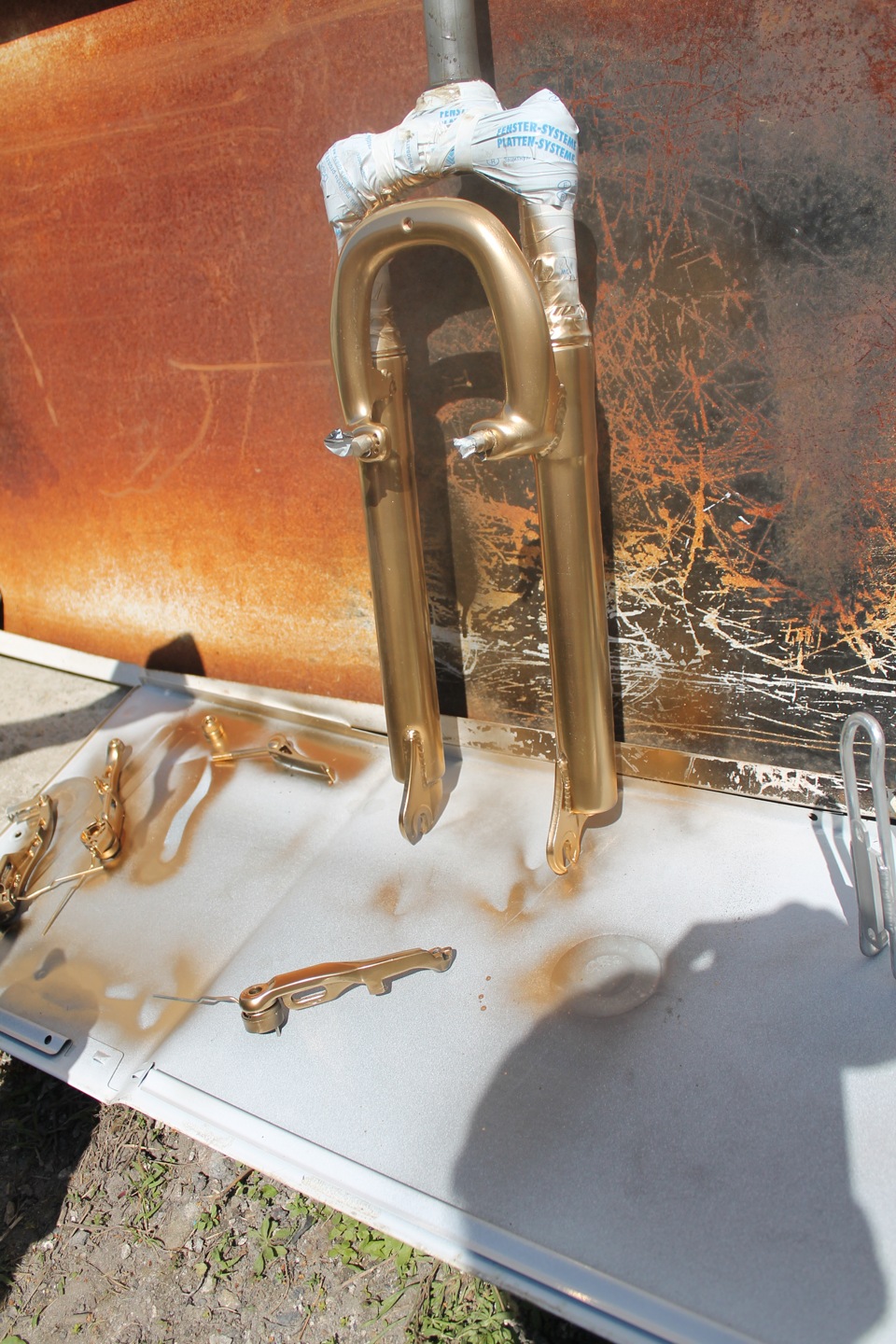 Это была вилки и тормозная система. Их решили покрасить в золотой цвет. Тут краска так же наносилась в несколько слоёв.