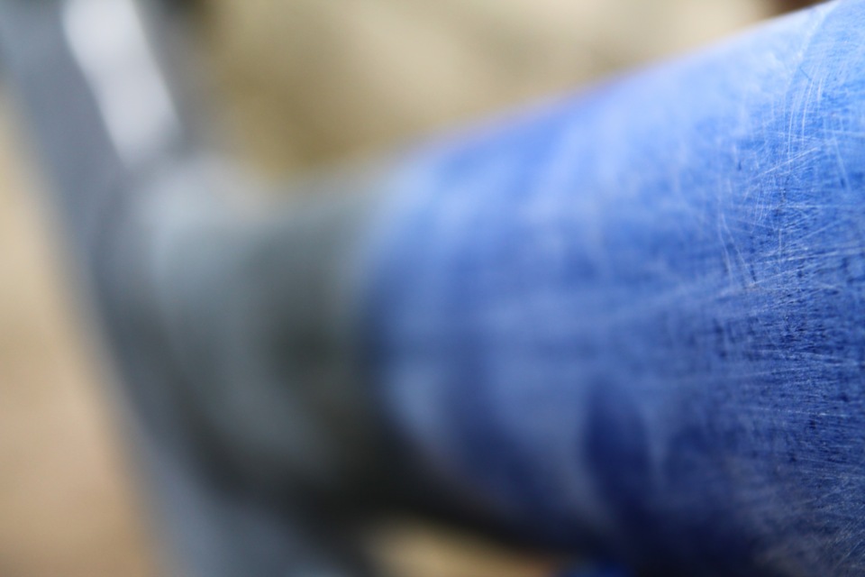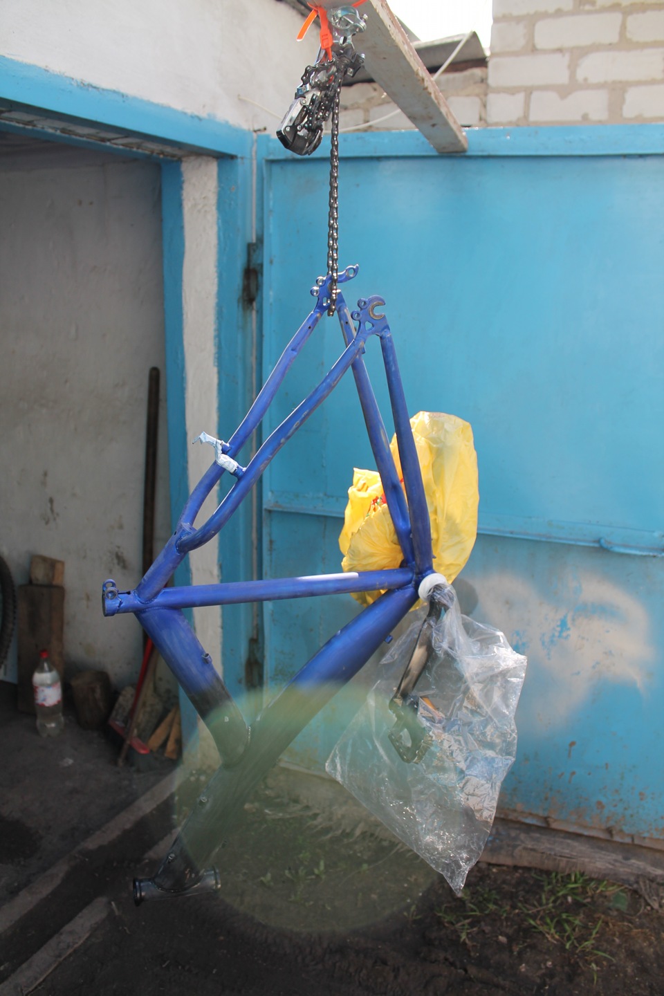 И так… Обезжирив велосипед, начал заклеивать места которые красить не надо. После того как всё заклеил захотелось красить, но на земле красить не очень удобно, поэтому папа решил его подвесить.