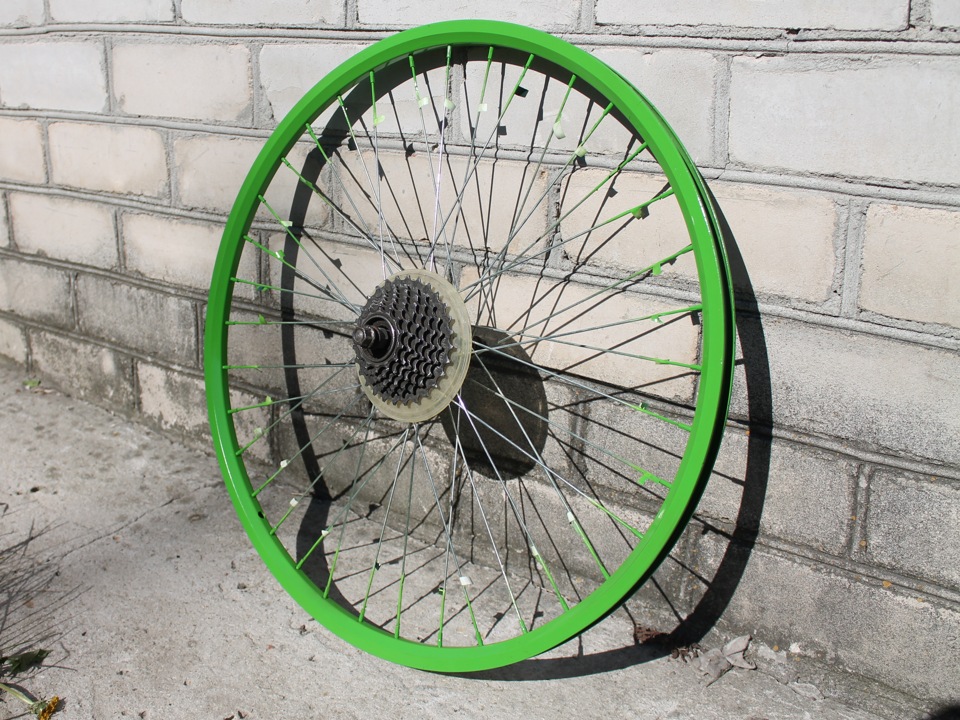 После покраски вилки и мелких деталей приступили к колёсам. Вообще я хотел оба сделать в цвет рамы, но так как опять краски не хватило пришлось делать одно зелёным, второе золотым. Тут очень повезло что начали с заднего колеса и на него хватило зелёной краски, и получилось всё грамотно: заднее колесо в цвет рамы, а переднее в цвет вилки.