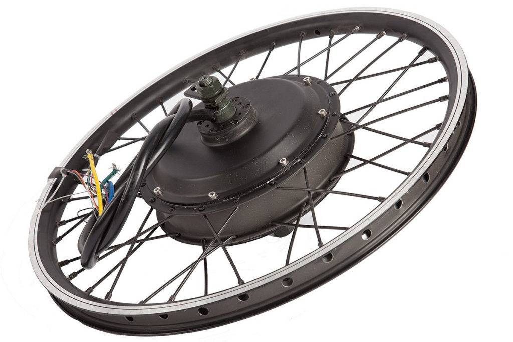 Данный тип электромотора в настоящее время обладает большей популярностью, нежели другие. Причина в том, что его просто установить на колесо и превратить рядовой байк в велосипед с мотором электрическим. Также для эксплуатации мотора-колеса необходимо обзавестись батареей, ручками запуска и регулирования скорости, аппаратом, контролирующим двигатель. А если велолюбитель предпочитает более денежный вариант, то данный двигатель производится уже встроенным в колесо, с полной комплектацией.