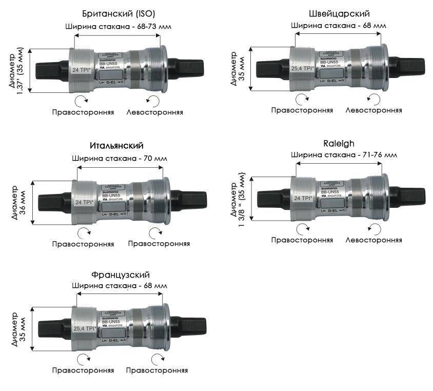 В настоящее время, наиболее популярным является английский стандарт (BSA), также известный как ISO, в котором ширина каретки составляет от 68 до 73 мм, а диаметр – 1,37 дюйма. Так же есть итальянский стандарт, с шириной каретки 70 мм и диаметром оси 36 мм, который чаще всего использовался в шоссейных велосипедах, и французский стандарт, с размерами — 68 мм и 35 мм соответственно. И в итальянском и французском стандартах используется только правая резьба, что создает риск отвинчивания правой опоры подшипника во время езды. Вариант французского — швейцарский стандарт, который отличается только использованием левой резьбы справа. Наименее популярным, является стандарт Raleigh, ранее используемый в старых британских велосипедах.
