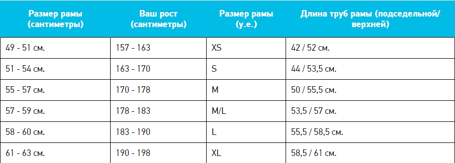 Размер рамы в таблице подбирается по росту, однако градаций гораздо меньше.