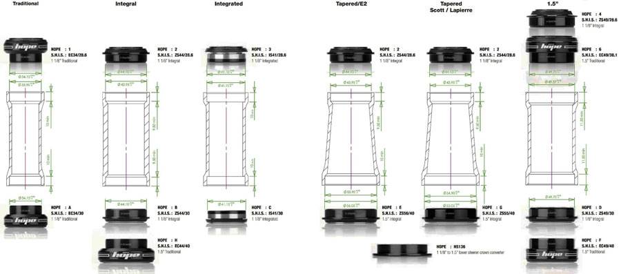 - Onepointfive Standard – созданный консорциумом из производителей велосипедов для экстремальных дисциплин неитегрированный стандарт под широкую рулевую трубу.
