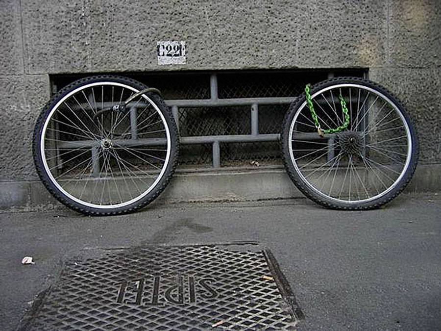 Иногда человек приходит, а от его средства передвижения остались только колесо и замок. Всё из-за того, что часто байки цепляют к колесу или вилке. Колесо снимают, а всё остальное уносят. Проходящие мимо люди вряд ли предпримут какие либо действия, многие из них решат, что это транспорт вора. В любом случае, в людном месте безопасность лучше.