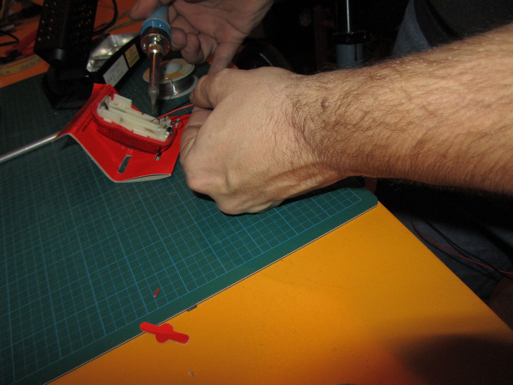 Фото №4: После того, как припой остынет, натяните провода. Замажьте отверстие, через которые проходят провода силиконовым герметиком, чтобы предотвратить попадание воды внутрь корпуса фонаря.