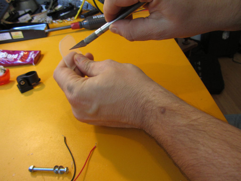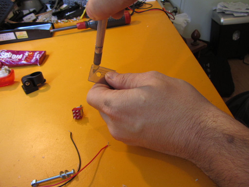 Сделаем крепление для переключателя. Возьмите кусок пластмассовой планки (можно металлическую). Сделайте три отверстия в ней: первое – для крепления на кронштейн, второе – для крепления переключателя и третье – для штырька на переключателе: чтобы он не вращался.