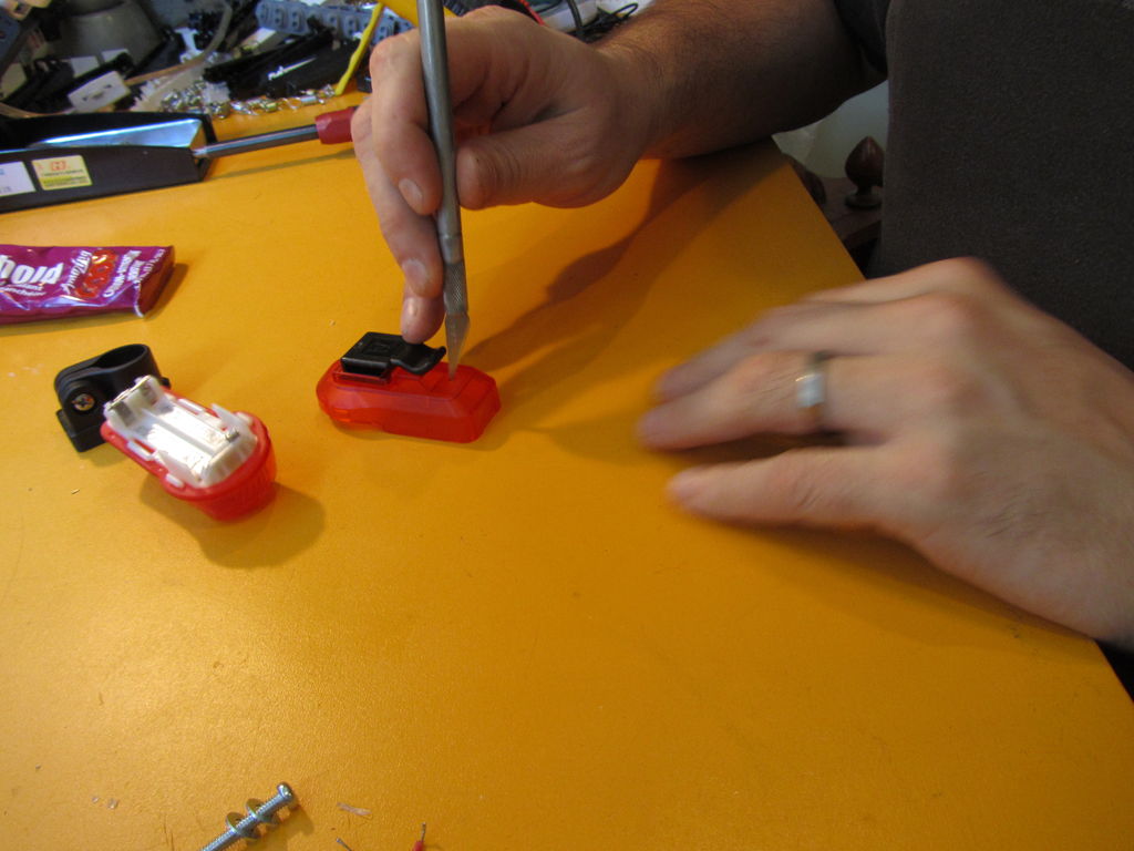 Фото №1: Сначала просверлите небольшое отверстие в задней части крышки батарейного отсека фонаря. Отверстие должно быть таким, чтобы через него проходили два провода.