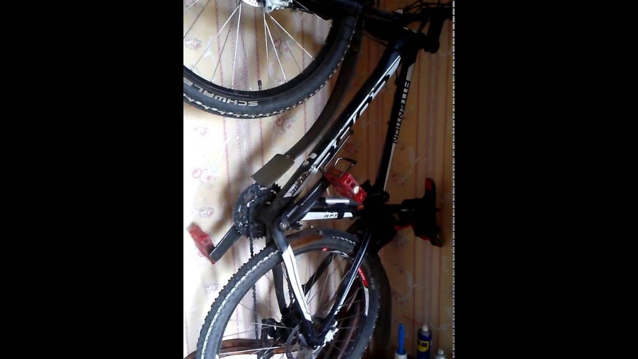 Популярный вариант, экономящий место на полу. Достаточно установить держатель за переднее колесо на стену. Крепеж требует применения силы при подвешивании, снятии велосипеда, особенно если это не сверхлегкое оборудование.