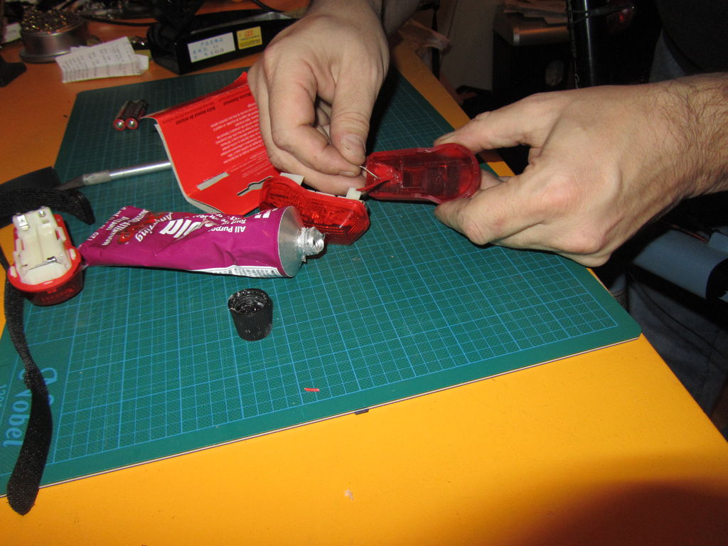 Автор собрал свою самоделку из трех фонариков, которые нашел у себя дома. Чтобы не придумывать отдельную схему для мигания фонарей, лучше всего приобрести уже готовые самые дешевые «мигалки» для велосипеда. Если обойтись самым бюджетным вариантом, то можно собрать простую схему на мигающем светодиоде.