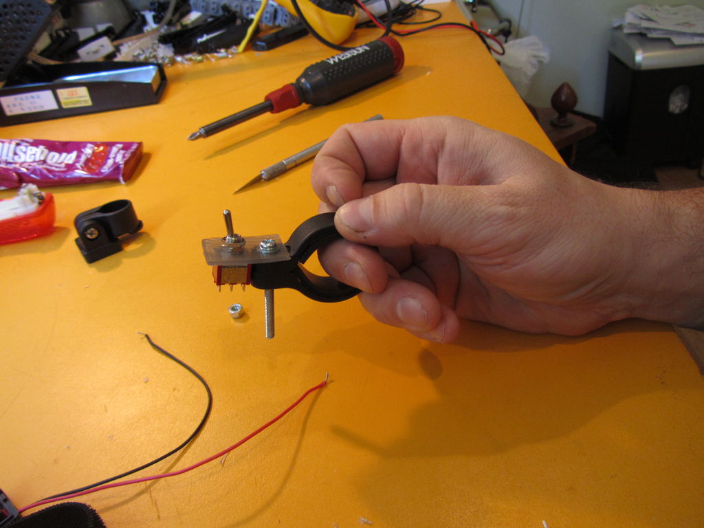 Фото №6: Просверлите отверстие на планке для крепления ее к хомуту. Прикрутите планку с выключателем к крепежному хомуту.