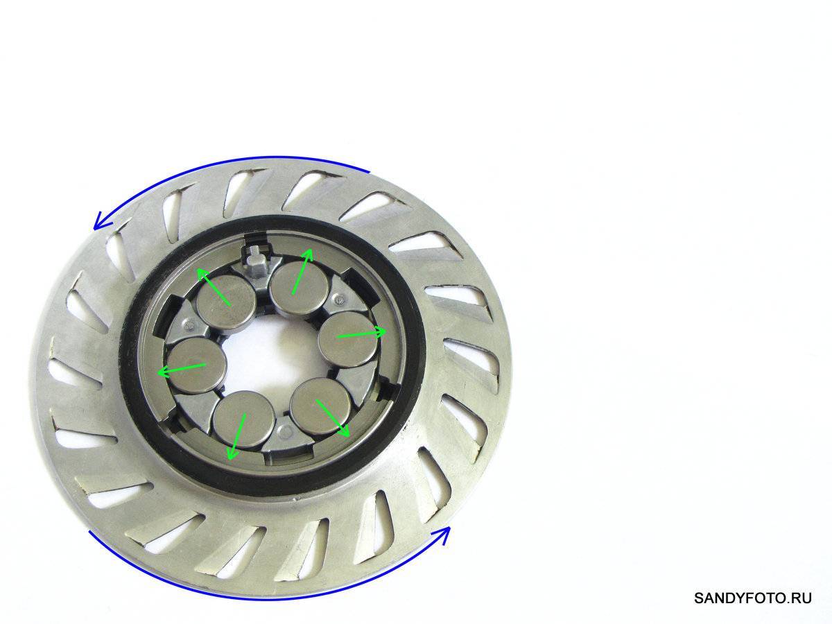 Перейдём от слов к схеме, всё что я описал чуть выше, очень хорошо на ней отображено. Схема конечно предельно упрощённая, на ней изображены лишь самые основные элементы конструкции роллерного тормоза, зато она предельно наглядно отображает принцип работы роллерного тормоза. Принцип работы, изображённый на схеме, применим ко всем моделям роллерных тормозов. На схеме изображены следующие элементы тормоза: барабан (внешнее кольцо), три тормозных колодки, шесть роликов и эксцентрик: