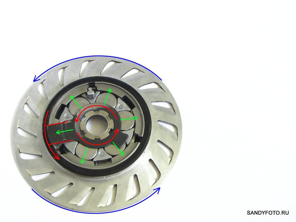 Давайте посмотрим, что же происходит в этот момент внутри тормоза. Для этого снимем крышку тормоза и уберём детали, мешающие обзору. Внутри тормоза происходит следующее: рычаг-эксцентрик движется и выступами упирается в ролики, которые давят на тормозные колодки, они же в свою очередь упираются в рабочую поверхность вращающегося тормозного барабана. Синими стрелками указано направление вращения тормозного барабана, красными стрелками указано движение рычага-эксцентрика, зелёными стрелками указано направление движения роликов: