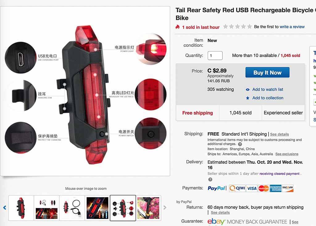 Идем на eBay (или Али, или в ваш любимый интернет-вело-магазинчик), вводим в поиск (кликабельно): “bike rear light usb” и смотрим, что нам предлагают поднебесные (и не очень) производители.