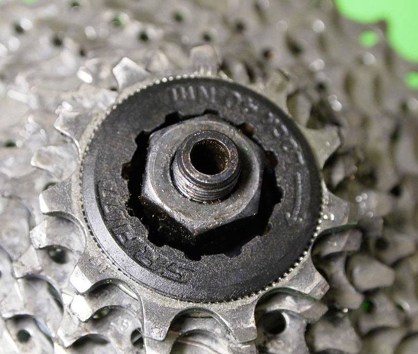 Обратите внимание, что один из шлицов на барабане храповика имеет наименьшую ширину, и ему соответствует узкий паз на каждой звездочке кассеты. Все они должны выстраиваться в одну линию. Храповик после снятия кассеты выглядит как на девятом изображении