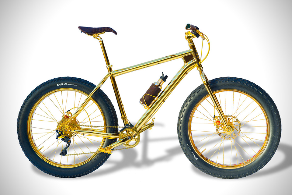 - Gold MTB. На украшение этого горного велосипеда из 24-каратного золота ушло больше 600 черных бриллиантов и 500 золотистых сапфиров. Даже фляга покрыта драгоценным металлом.