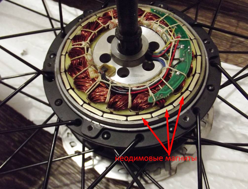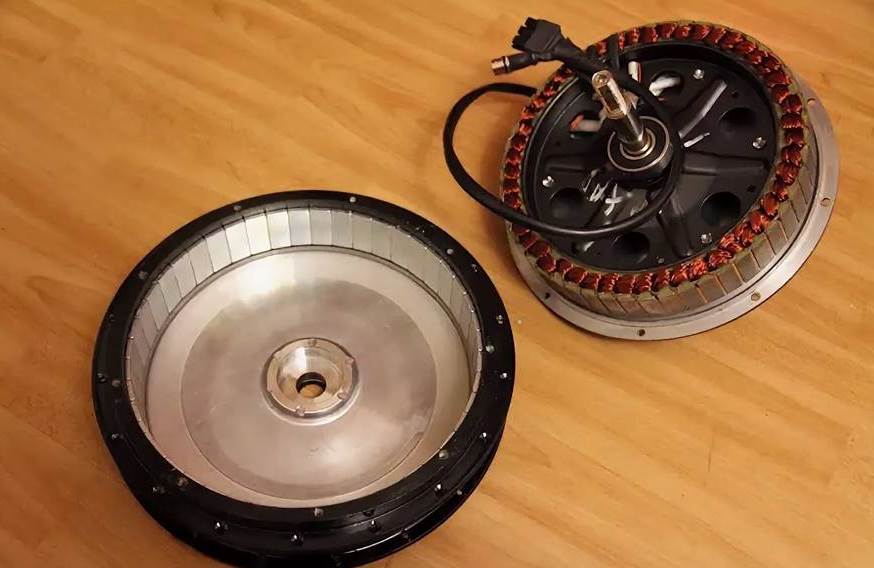 Статор, как и в редукторном мотор-колесе, состоит из неодимовых магнитов, а ротор из медной обмотки.