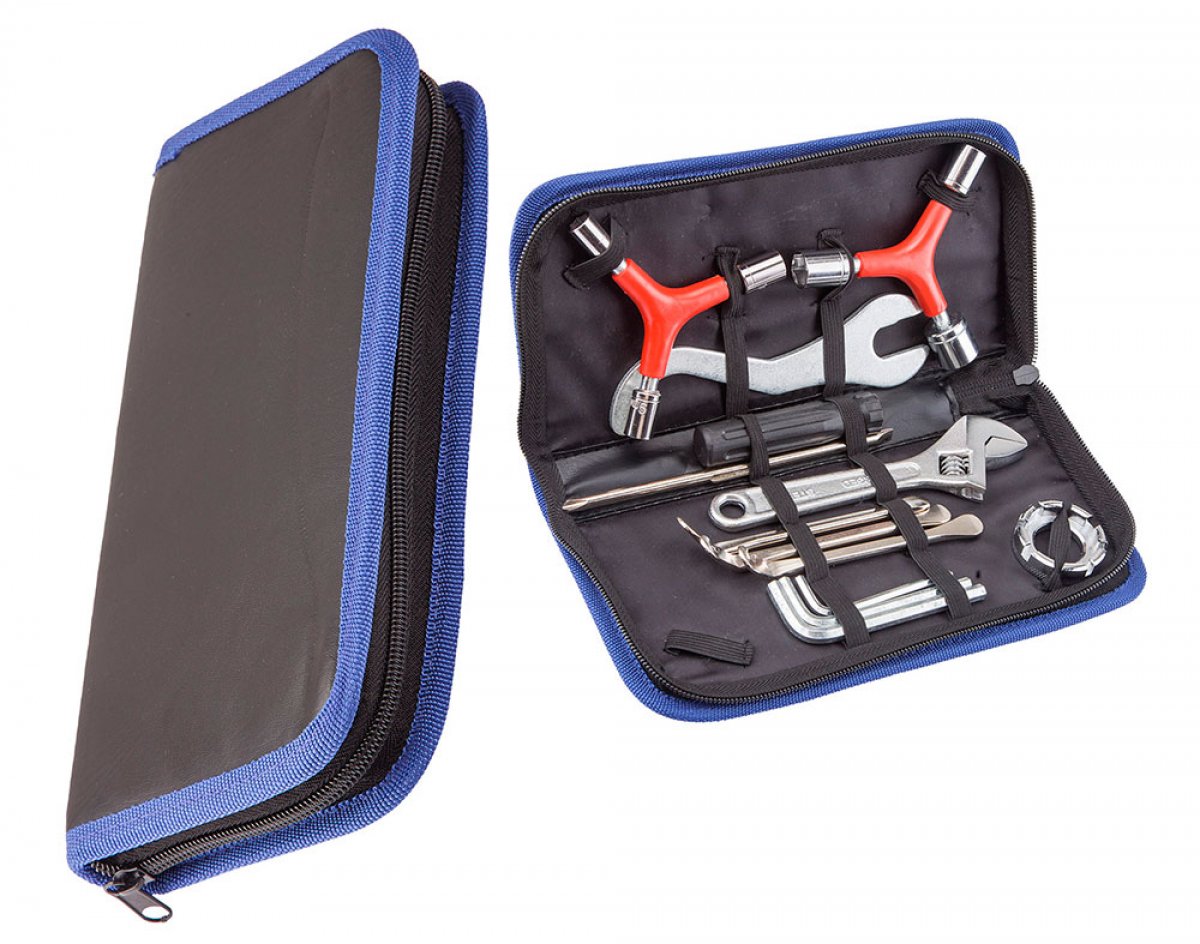 Состоит из 11 предметов, чего вполне хватит для проведения простых, экстренных ремонтов в полевых условиях. Благодаря его применению пользователь может демонтировать велопокрышки, осуществить ремонт пробитой камеры, а также затянуть, подтянуть спицы.