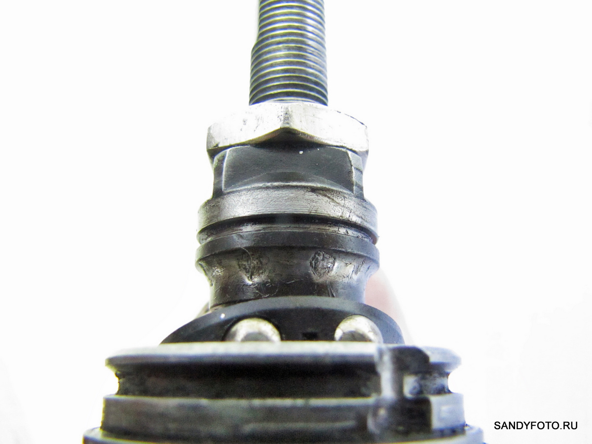 Переходят к монтажу троса в механизм Bell Crank. С узла снимают крышку, открутив крепежный винт. Ослабляют гайку фиксации, трос пропускают через регулировочный болт между пластинкой и гайкой. Выставляют вторую скорость, натягивают трос, при этом линк должен быть между 2 белыми полосами.