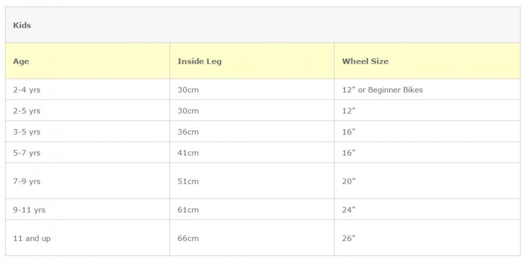 | Рост ребенка | Возраст | Диаметр колеса (в дюймах) |