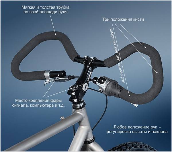 Обычно же ездят, положив ладони на ручки «автоматов» (тормозных ручек), посадка при этом всё равно не становится вертикальной, но её и не назовешь низкой. К тому же, руль-баран дает огромное количество хватов, при которых можно постоянно менять положение рук, и это очень полезное свойство в длительных покатушках.