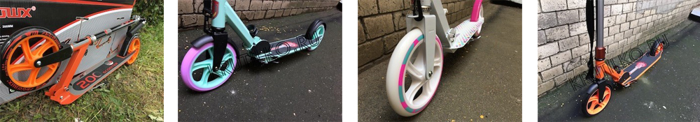 - Модели с полиуретановыми колесами отличаются максимальной скоростью и мобильностью – именно эти модели являются наиболее популярными и чаще всего приобретаются для комфортной городской езды. Размер колес в них колеблется от 12,5 до 20 см, причем чем больше колеса, тем большую скорость способен развить самокат.