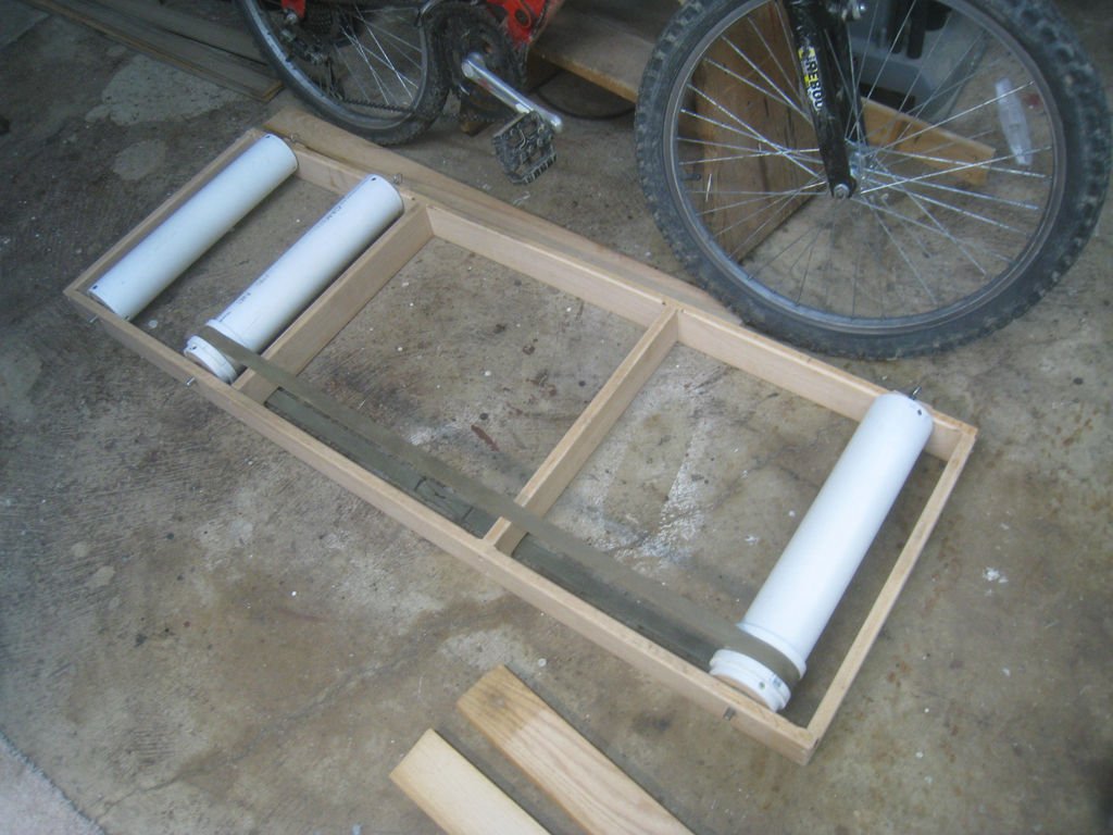 Этот станок представляет собой плоскую конструкцию, немного поднимающуюся над землей. Поперек устанавливается три ролика – два сзади и один спереди. Заднее колесо устанавливается поперек двух задних роликов, переднее – упирается в передний ролик-трубку.