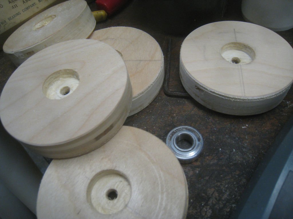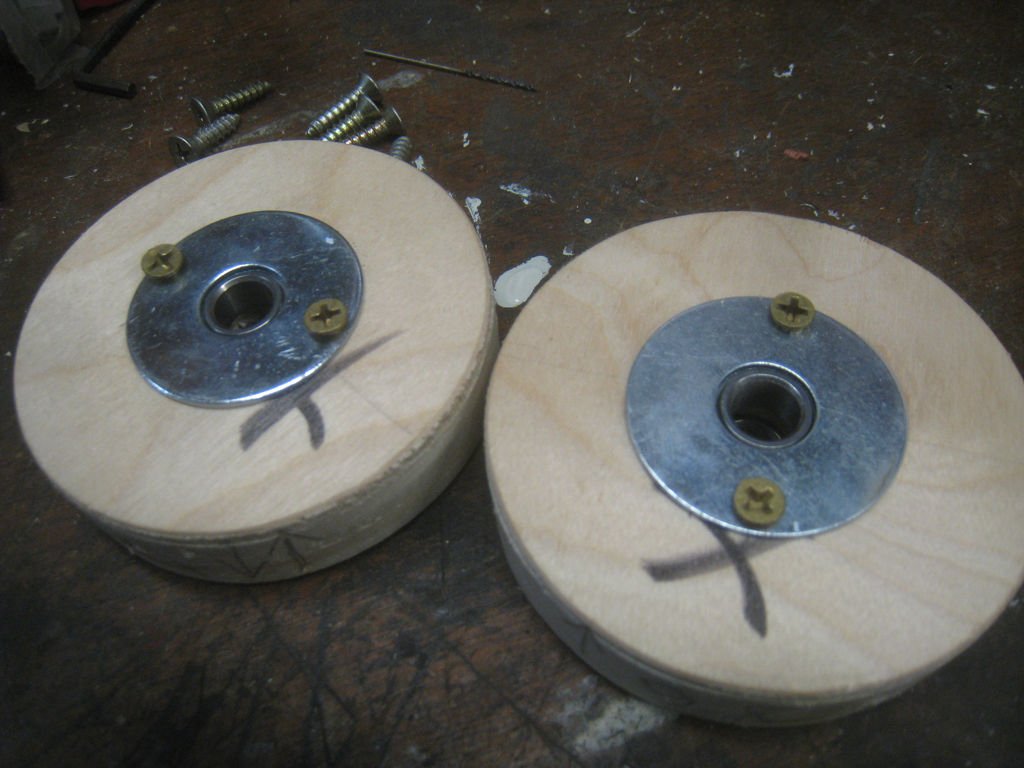 Вам придется самостоятельно выпилить диски из фанеры и проделать в них 2 углубления для шурупов (см. фото 2). С помощью увеличенных шайб нужно зафиксировать положение подшипников.