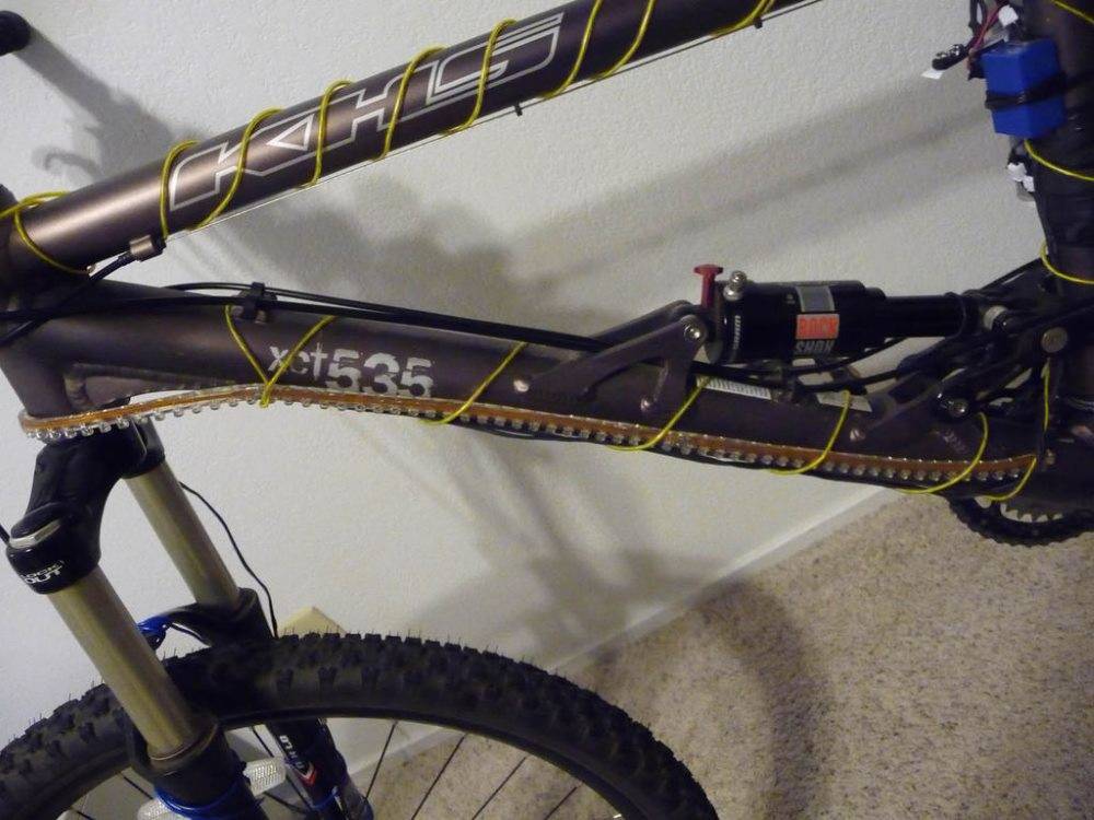 Затем собрать цепь между отрезками и подключить их к девяти вольтовой батарее. Источник питания и выключатель лучше всего закрепить на втулке колеса, подальше от воды и грязи. Не забудьте места электрических соединений залить термоклеем. Вот и готова подсветка колес велосипеда!