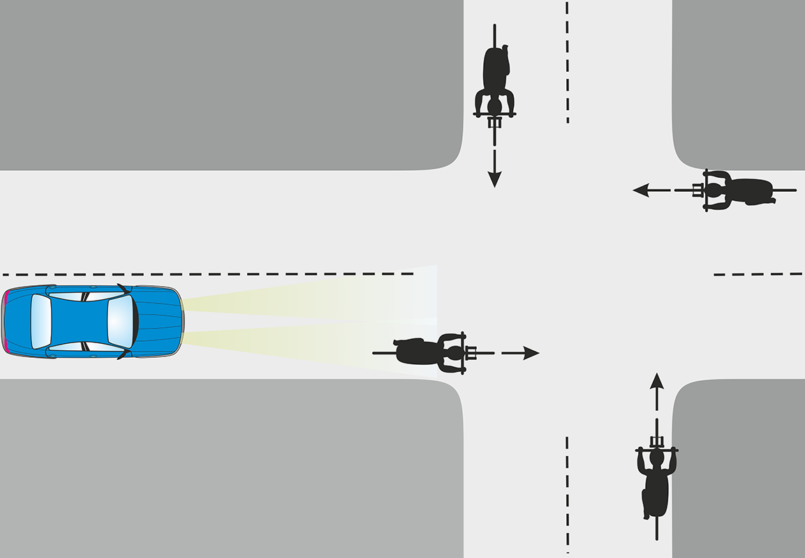 Из-за ограниченного сектора обзора луча фары на пересекаемой дороге из темноты может внезапно появится велосипедист и угодить прямо под колёса машины. Это хорошо видно из рисунка выше.