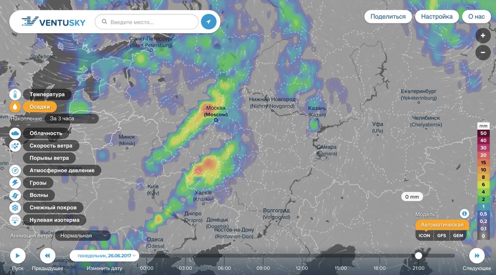 На данный момент я пользуюсь двумя хорошими погодными сайтами — yr.no, которым рулит метеорологический институт Норвегии, а также ventusky.com. Последний сайт дает детализированную модель движения воздушных масс, это позволяет понять, надвигается циклон на вашу местность или это просто ветер принес дождевые тучи.