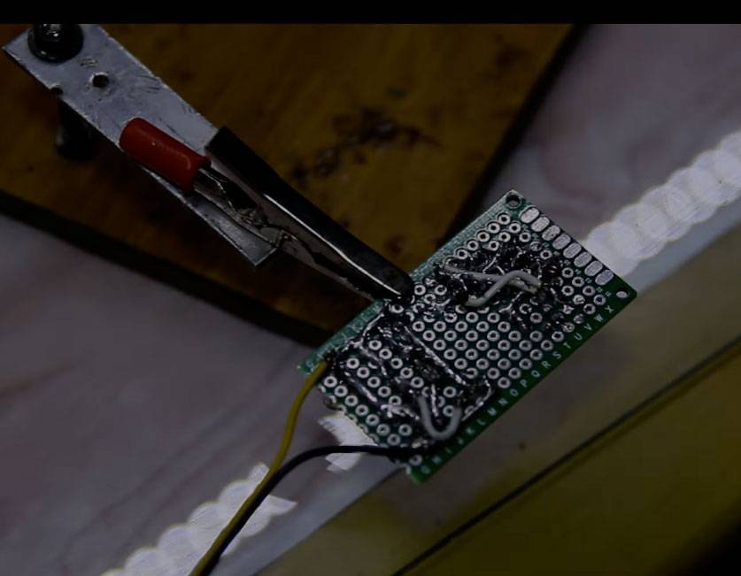 Когда все соединения готовы, устанавливаем все элементы цепи на их места в соответствие с разметкой. На последнем этапе припаиваются провода питания от схемы к батарее.
