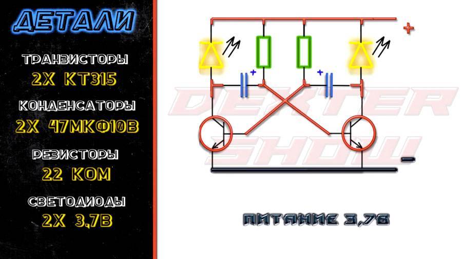 Принципиальная схема мигалки на 2 диода